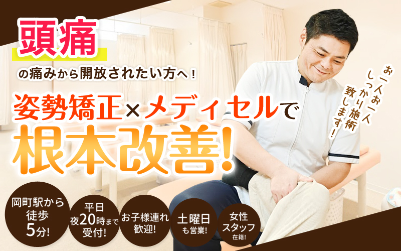 当院では、頭痛の根本原因である首周辺の筋肉の緊張を和らげ、優しいタッチで骨格の歪みをミリ単位で整えていきます。そして筋肉の緊張を更に緩めるために筋肉の表面にある「筋膜」がコリの原因にもなりますので癒着して硬くなった筋膜を筋膜はがし専用の機械メディセルで癒着をはがして血流・リンパの流れ改善を行います。